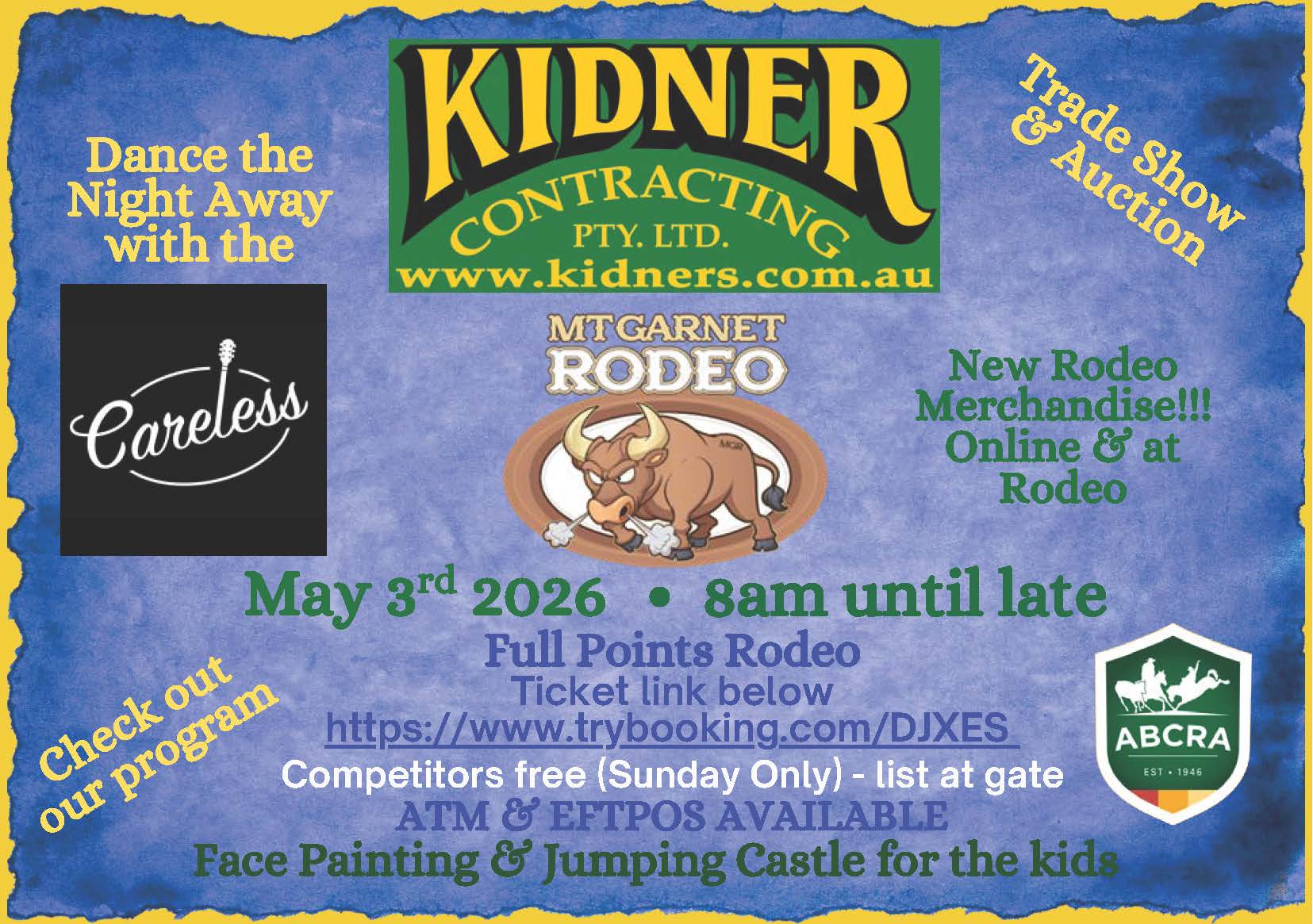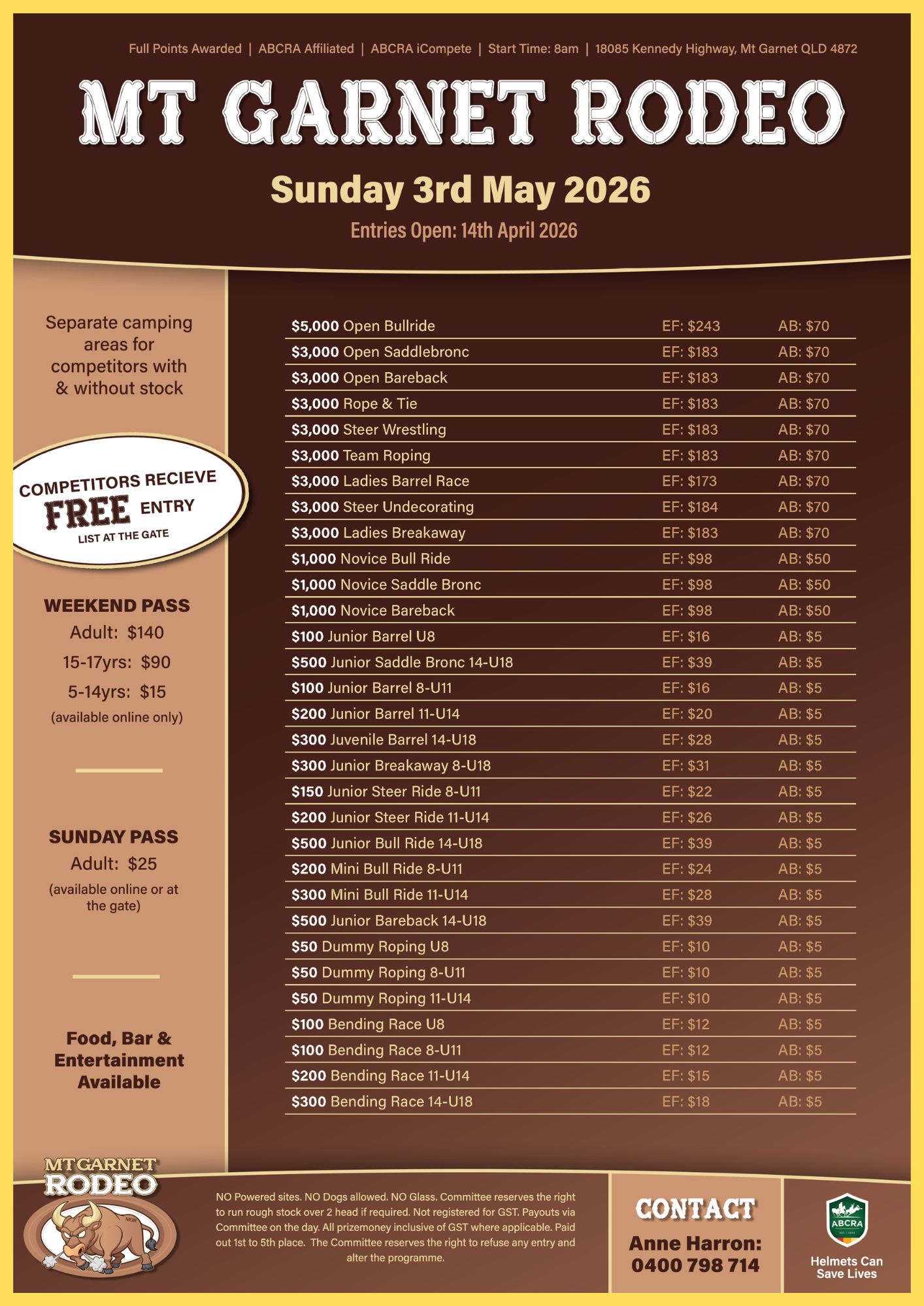 Yes, links to TryBooking are available on our website. The Mt Garnet Reserve manages ticketing so please do not contact the Rodeo Association regarding tickets.
