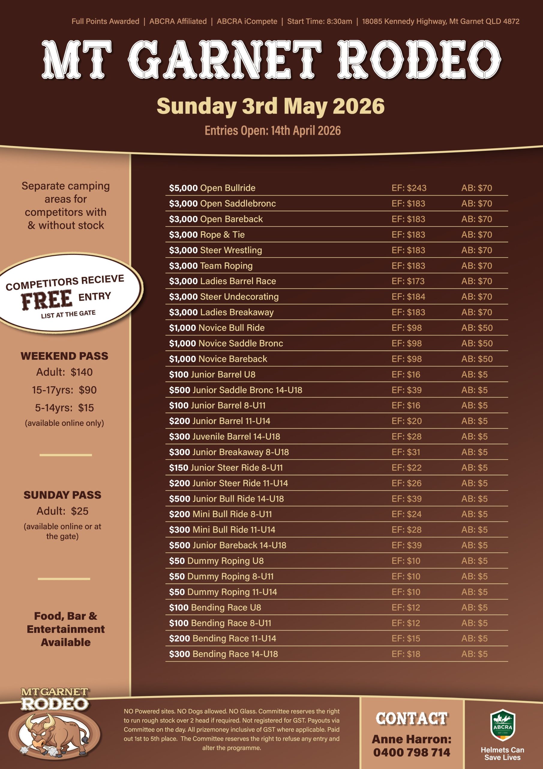 Sponsors requiring a weekend pass, please contact the Rodeo secretary to organise a discounted pass at the gate.